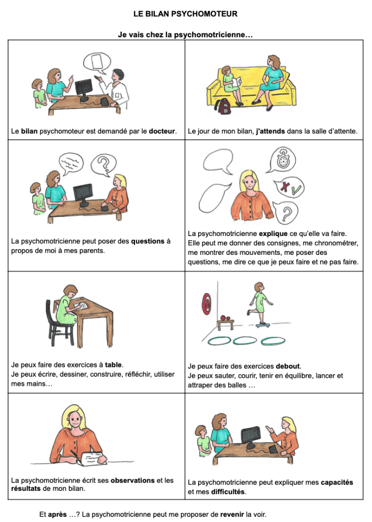 Bande dessinée permettant d’expliquer le déroulement de la passation du bilan psychomoteur au patient, afin de diminuer son éventuel stress (création originale d’Eléonore JOURDAN, étudiante à l’Institut de Formation en Psychomotricité de Montpellier)
